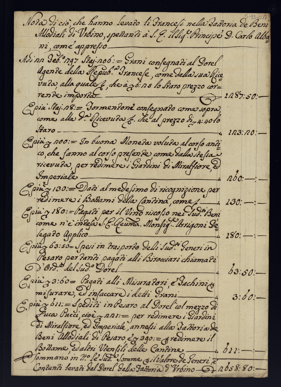 Note e stime dei beni sottratti alla Casa Albani durante l'invasione francese