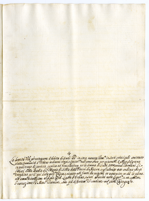 Applicazione dei frutti della Badia di Santa Maria di Sitria della diocesi di Nocera alla città di Urbino per la estinzione del debito di scudi 35.000 circa