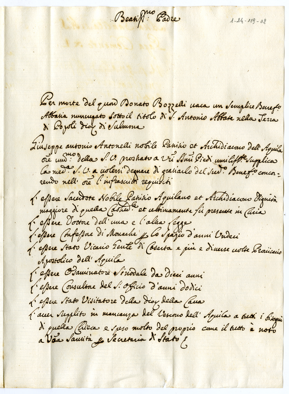Supplica il Santo Padre affinchè gli venga assegnato il beneficio vacante per morte di Donato Bozzelli sotto il titolo di Sant'Antonio Abate nella terra di Popoli. Elenca i suoi requisiti