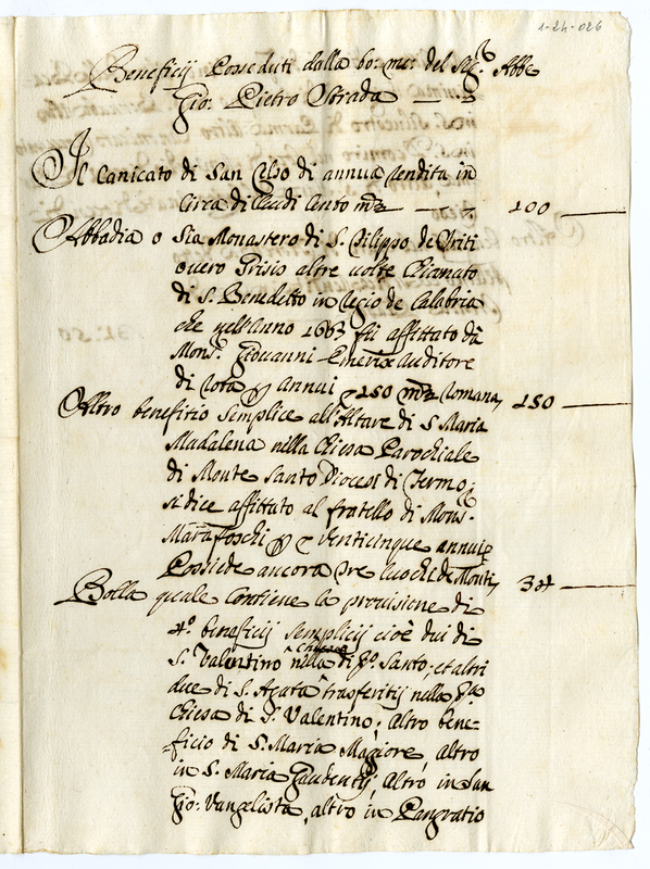 Benefici posseduti dalla buona memoria del Signor Abbate Giovanni Pietro Strada (1700-1721)