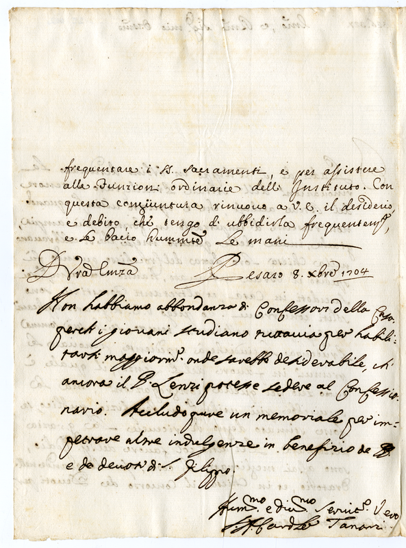 Lettera dei padri di San Filippo in Urbino al Cardinale Colloredo con aggiunta del Cardinale Tanara al medesimo Cardinale (1704 dicembre 8)