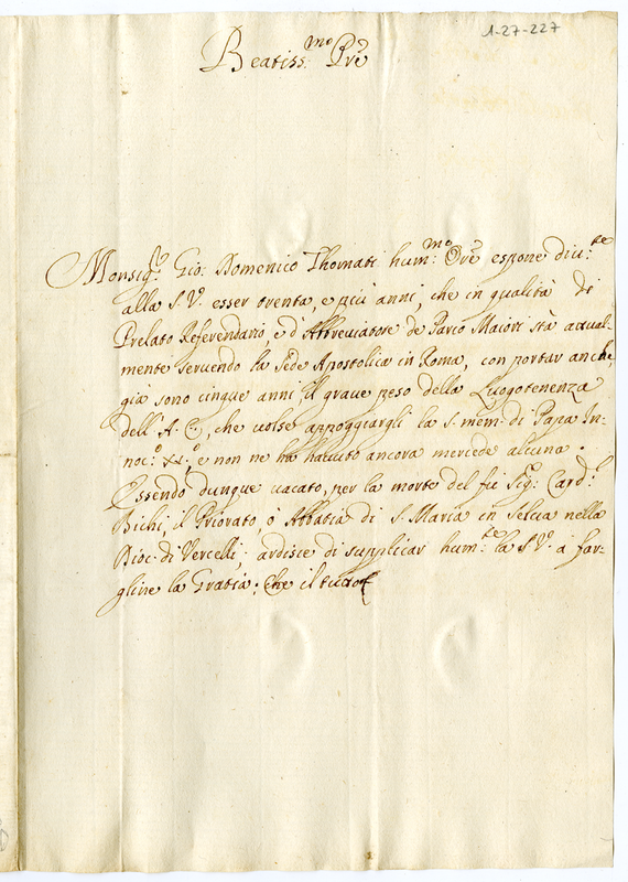 Lettera di Monsignor Giovanni Domenico Tomati al Papa Innocenzo XII (1691)