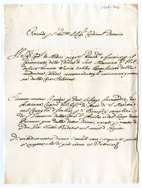 Raccomandazioni del Cardinale de Medici in favore di Ernesto Enrico Kohlez e di don Filippo Hernandez de Arterana (1699)