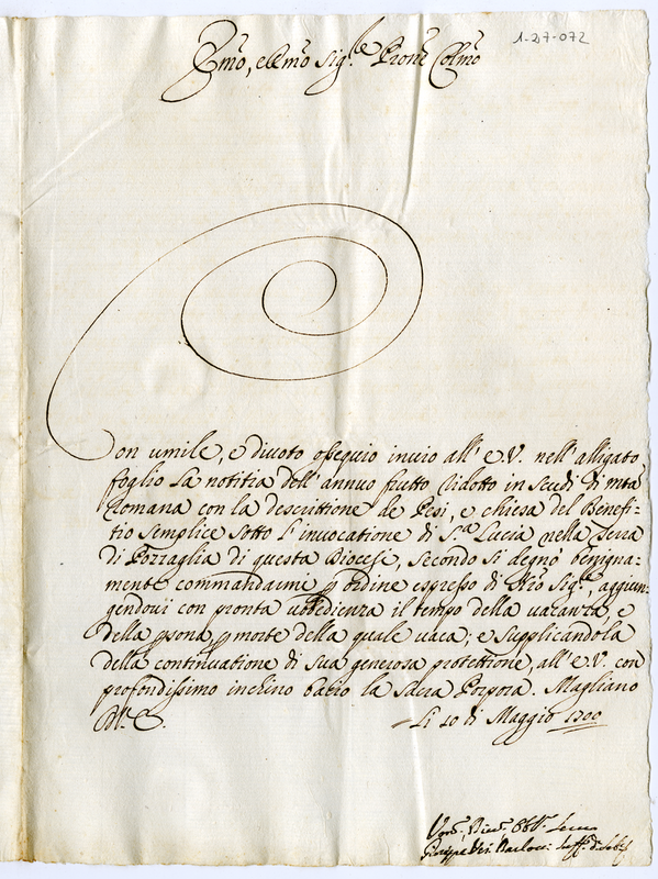 Lettera di Giuseppe Barlocci Vescovo di Magliano ad un Cardinale (1700 maggio 10)
