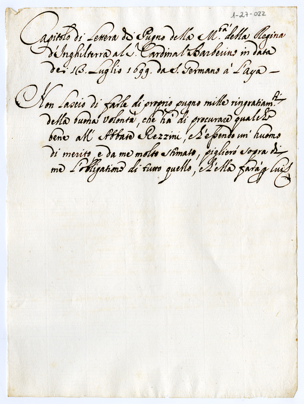 Capitolo di lettera di pugno della Maestà della Regina d'Inghilterra al Signor Cardinale Barberini in data dei 13 luglio 1699 da San Gerrmano a l'Aja
