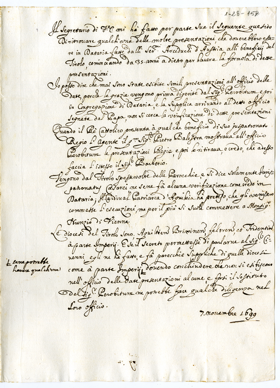 Memoria sulla formula delle presentazioni fatte dai serenissimi Arciduca d'Austria ai benefici del Tirolo (1699 novembre 7)