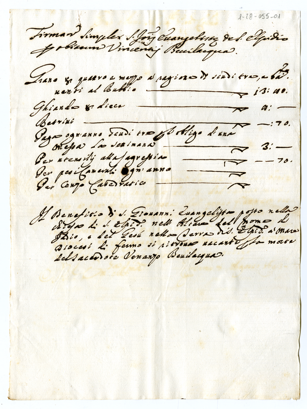 Descrizione del beneficio semplice sotto il titolo di San Giovanni Evangelista nella chiesa di San Elpidio vacante per morte di Vincenzo Bevilacqua (1693)