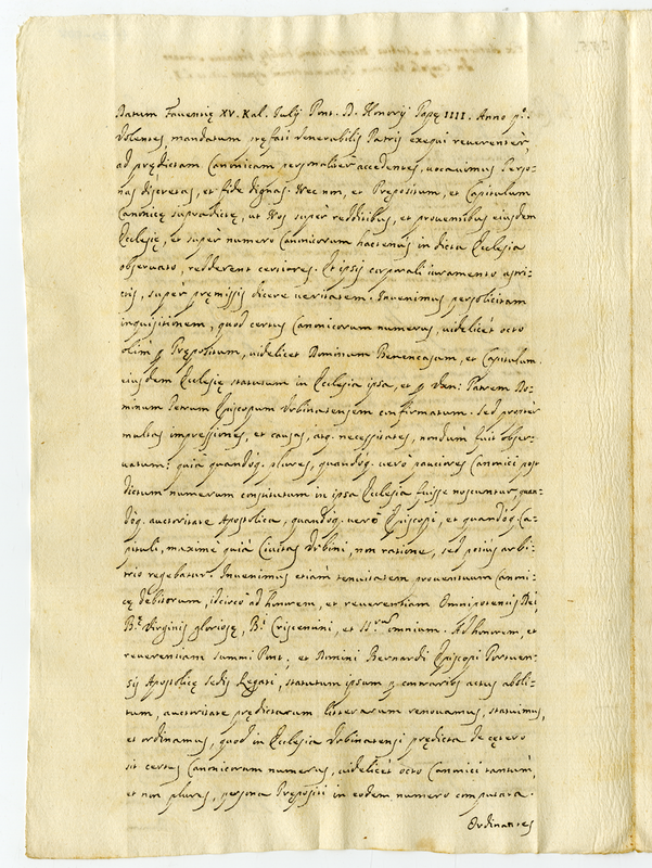 Trascrizione di un documento antico dell'anno 1285 nel quale Papa Onorio IV istituiva il numero dei Canonici della Metropolitana di Urbino che non dovevano superare il numero di otto (1600-1700)