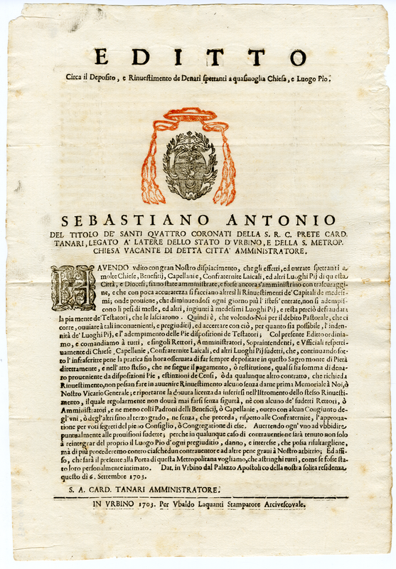 Editto circa il deposito, e rinvestimento de denari spettanti a qualsivoglia chiesa, e luogo Pio (1703 settembre 6)
