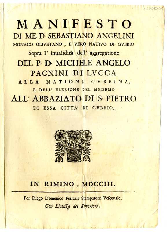 Manifesto di me d. Sebastiano Angelini monaco olivetano, e vero nativo di Gubbio, sopra l'invalidità dell'aggregatione del p. d. Michele Angelo Pagnini di Lucca alla nationi gubbina e dell'elezione del medemo all'abbaziato di S. Pietro di essa città di Gubbio (1703)