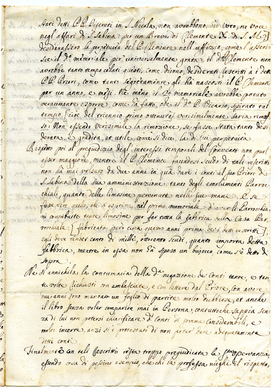 Ragioni per la rimozione del padre Clemente Leoni domenicano dall'amministrazione della parrocchia di san Nicolò dei Perfetti dipendente dai padri domenicani di Santa Sabina (1700-1721)