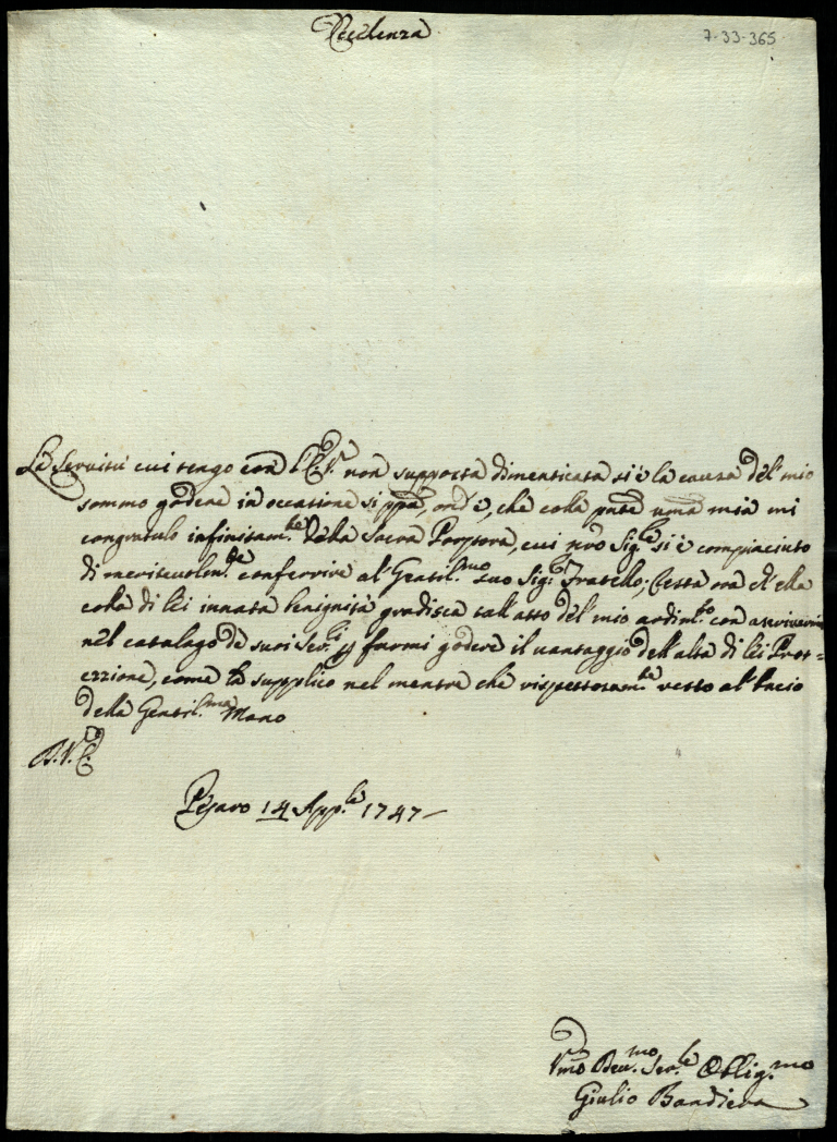 Lettere ricevute in Urbino dal Signor Principe Orazio Albani ultimo di questo nome nell'anno 1747