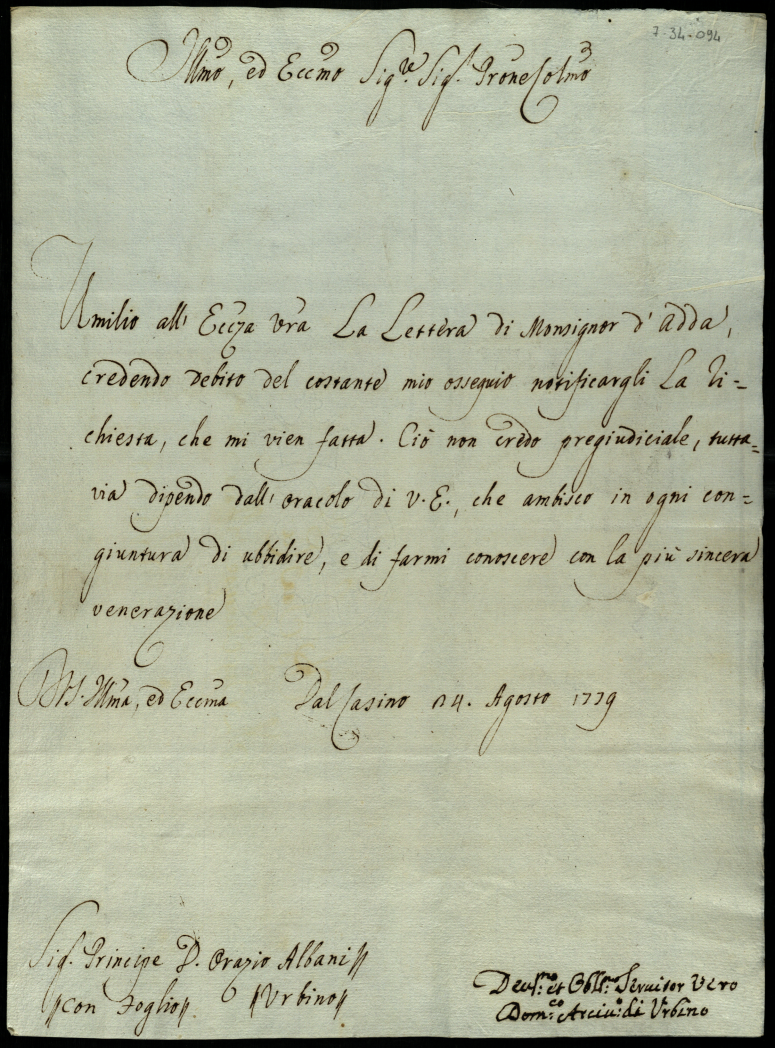 3. Lettere diverse ricevute dal principe Orazio Albani nella permanenza in Urbino del 1779