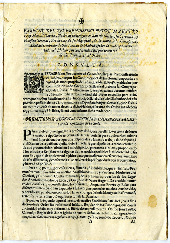 Parere del Reverendissimo Padre Maestro Emanuel Garcia sulla questione dell'abito dei Premonstratensi di Spagna. Segue il Breve di Urbano VIII sulla stessa questione del 1641