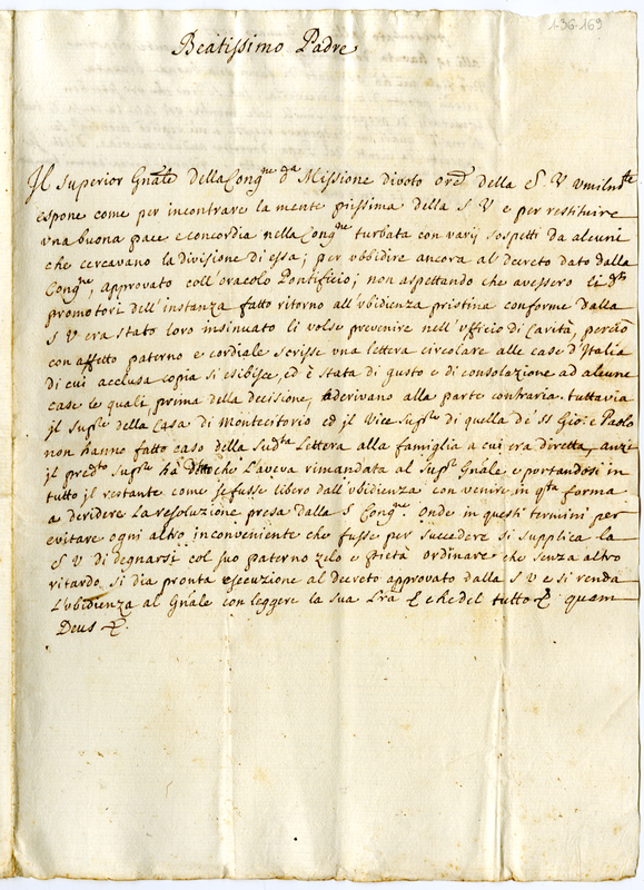 Lettera del Superiore Generale della Congregazione della Missione a papa Clemente XI (1700-1721)