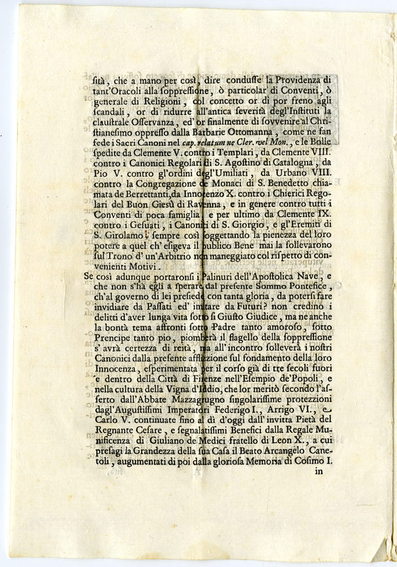 4. Considerazioni dei Canonici Regolari di San Salvatore sulla soppressione del loro convento a Firenze (1700-1721)
