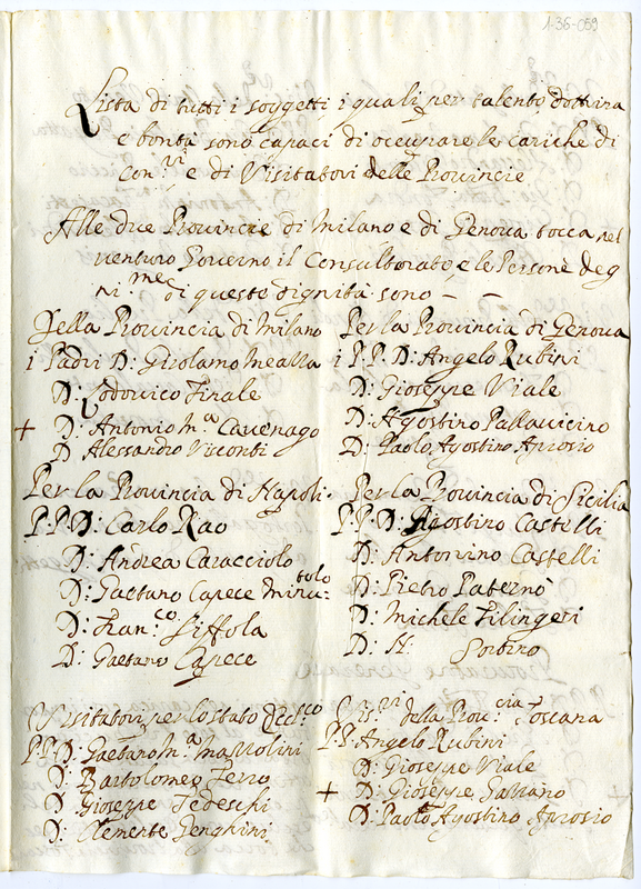 Lista di tutti i soggetti i quali per talento, dottrina e bontà sono capaci di occupare le cariche di Consultori e di Visitatori nelle varie Provincie (1700-1721)