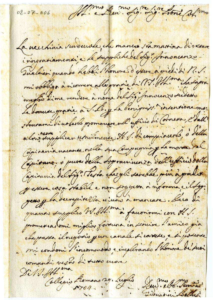 Lettera di Giovannino Bellusi ad un prelato (1704 luglio 29)