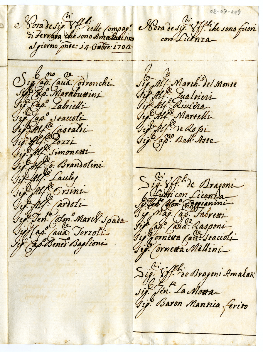 Nota dei signori ufficiali delle compagnie di Ferrara che sono ammalati o in licenza (1702 ottobre 14)