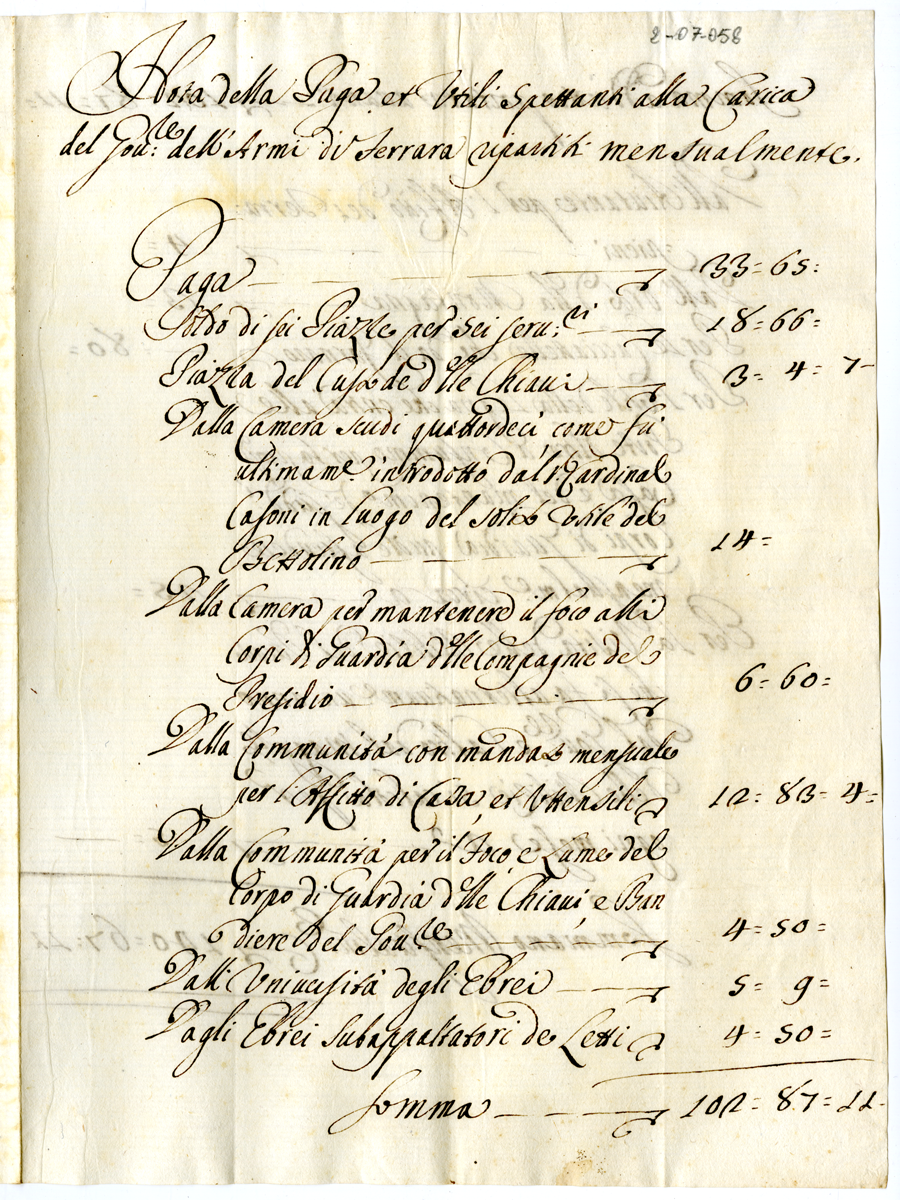 Nota della Paga et Utili Spettanti alla Carica del Governatore dell'Armi di Ferrara ripartiti mensualmente (1700-1721)