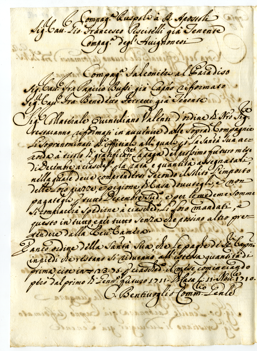 4. Copia. Adi 11 novembre 1710 Nota degl'Offitiali che devono riformarsi d'ordine di Nostro Signore