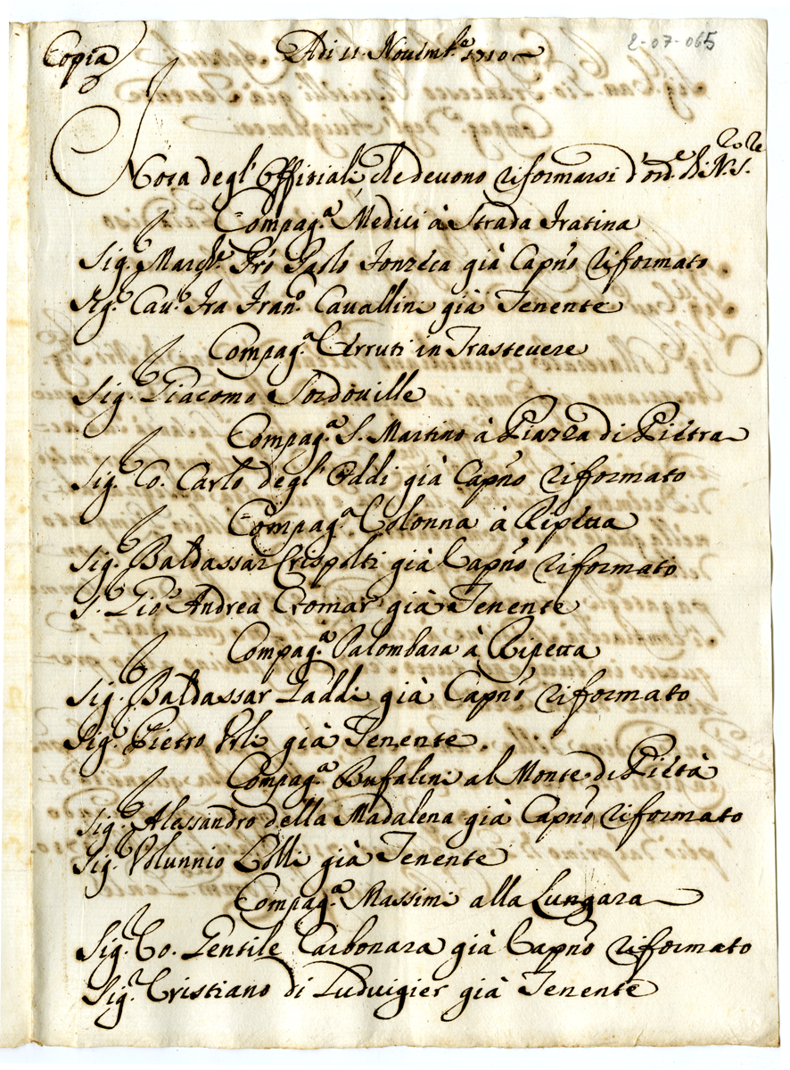 Copia. Adi 11 novembre 1710 Nota degl'Offitiali che devono riformarsi d'ordine di Nostro Signore