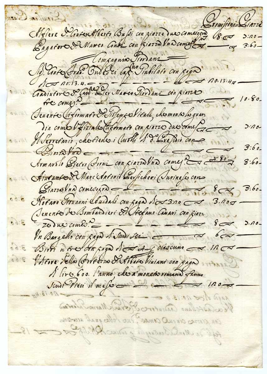 4. Nota delle Provisioni e Piazze, che si pagano ogni mese per il Presidio del Forte Urbano (1700-1721
