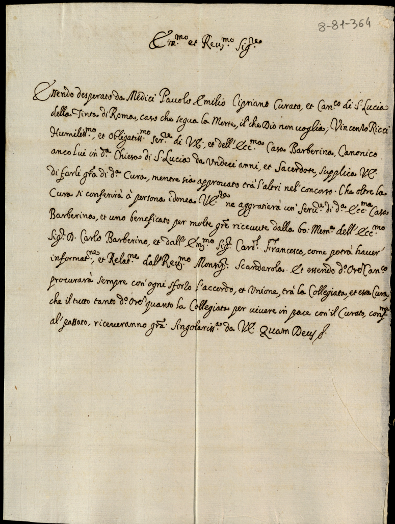 Memoriali diversi diretti al signor cardinale S. Onofrio