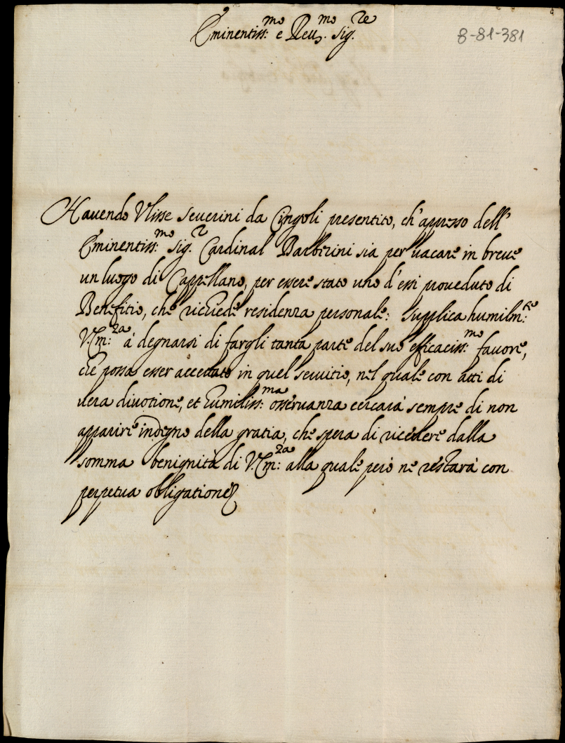 Memoriali diversi diretti al signor cardinale S. Onofrio
