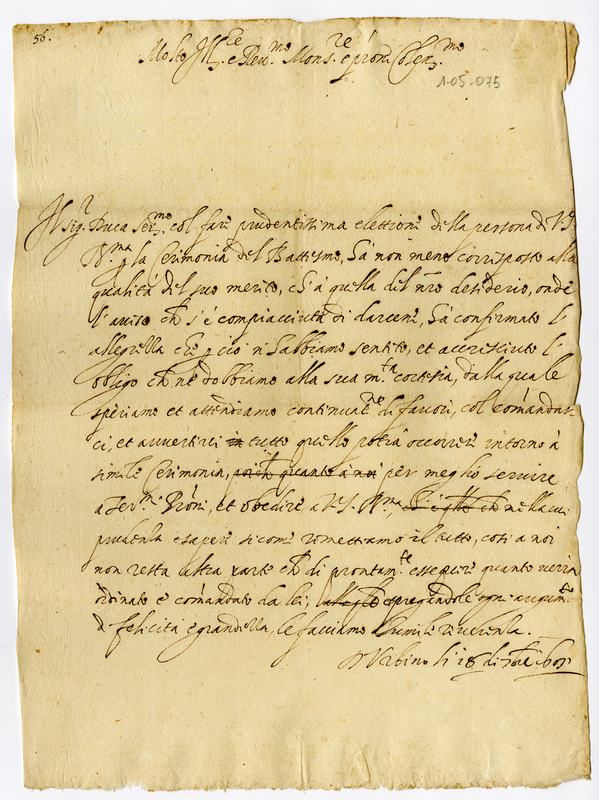 Il duca si congratula con il vescovo per la sua elezione a celebrante del battesimo di suo figlio Federico Ubaldo