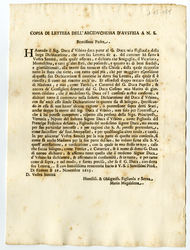 La granduchessa d'Austria dichiara di riconoscesere la devoluzione del ducato d'Urbino alla Santa Sede Apostolica