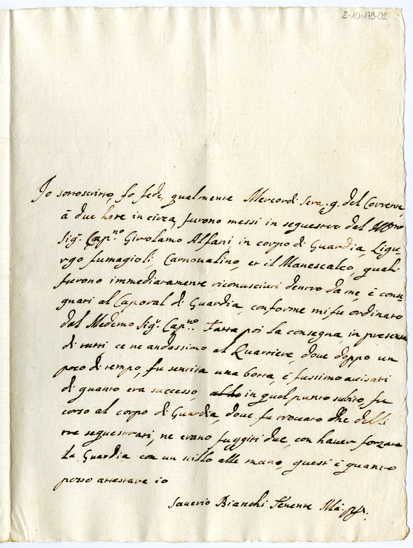 Dichiarazione di Saverio Bianchi sulla fuga di due arrestati (1709)