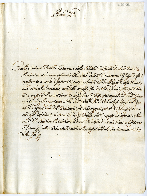 Lettera di Carlo Antonio Tortona, canonico nella Chiesa Collegiata di S. Marco in Roma a Clemente XI (1712)