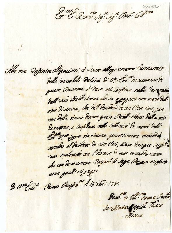 Lettera di suor Maria Angela Teresa Mosca al cardinale Annibale Albani (1731 dicembre 13)