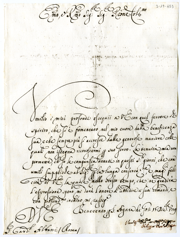Lettera di Filippo vescovo di Sant'Agata al cardinale Annibale Albani (1719 dicembre 15)