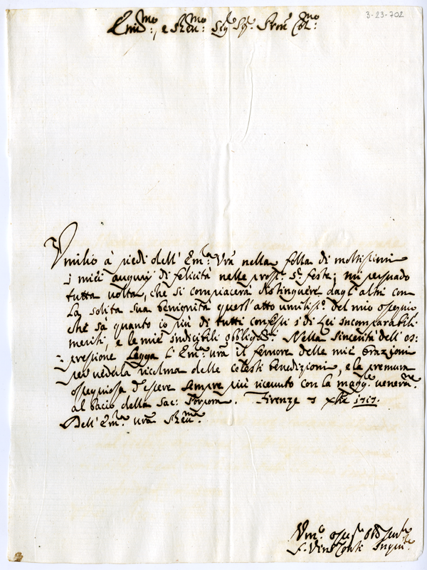 Lettera di fra Vincenzo Conti inquisitore al cardinale Annibale Albani (1717 dicembre 7)