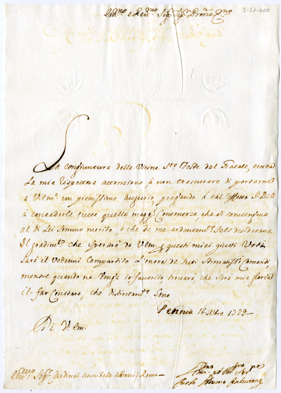 Lettera di Carlo Adamo Centurione al cardinale Annibale Albani (1729 dicembre 16)