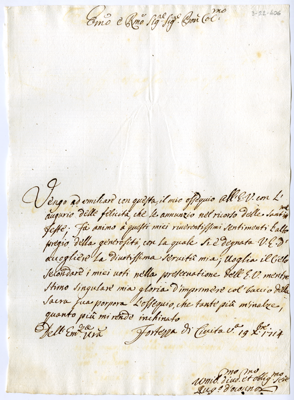 Lettera di Ruggero d'Oconnor al cardinale Annibale Albani (1714 dicembre 19)