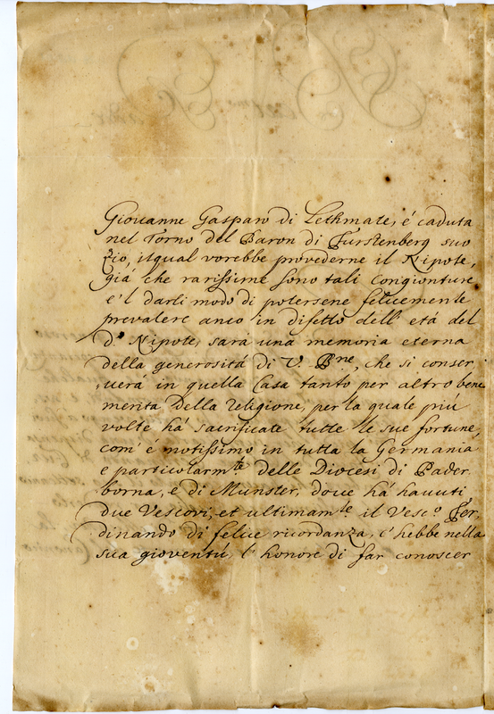 | dc.description | Chiede al Santo Padre una dispensa affinchè venga concesso un canonicato a favore di Ferdinando di Furstenberg di appena sette anni | |