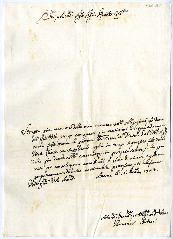 Lettera di Giovanni Bosdari al cardinale Annibale Albani (1728 dicembre 16)