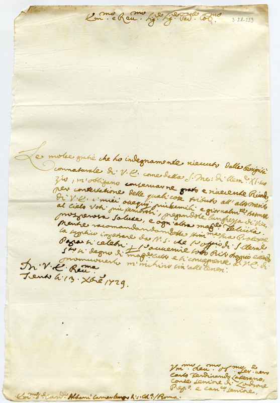 Lettera di Carlo Ferdinando Laterano conte di Lodrone al cardinale Annibale Albani (1729 dicembre 13)