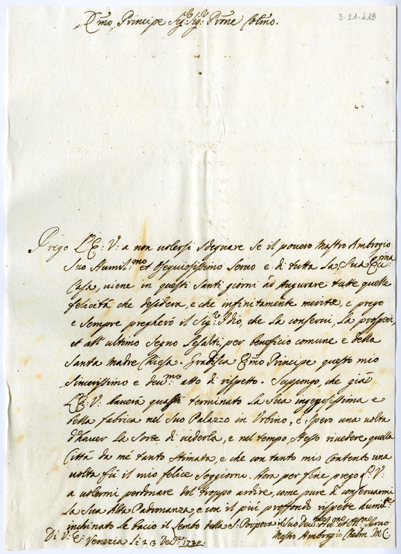 Lettera di Ambrogio Chelm al cardinale Annibale Albani (1729 dicembre 23)