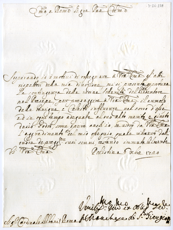 Lettera del marchese di San Giorgio al cardinale Annibale Albani (1720 dicembre 6)