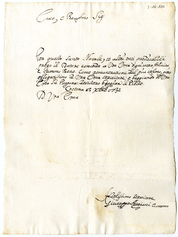 Lettera di Giuseppe Angioni economo al cardinale Annibale Albani (1731 dicembre 13)
