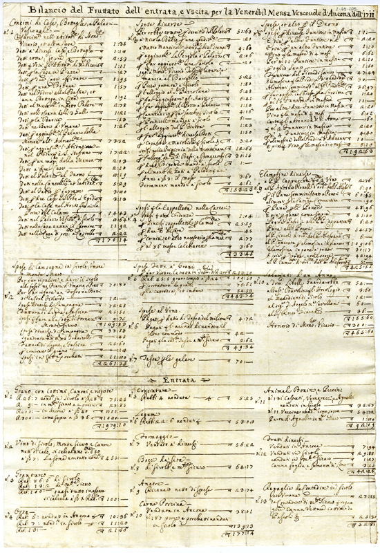 Bilancio del fruttato dell'entrata e uscita per la Venerabil Mensa Vescovile d'Ancona dell'1711