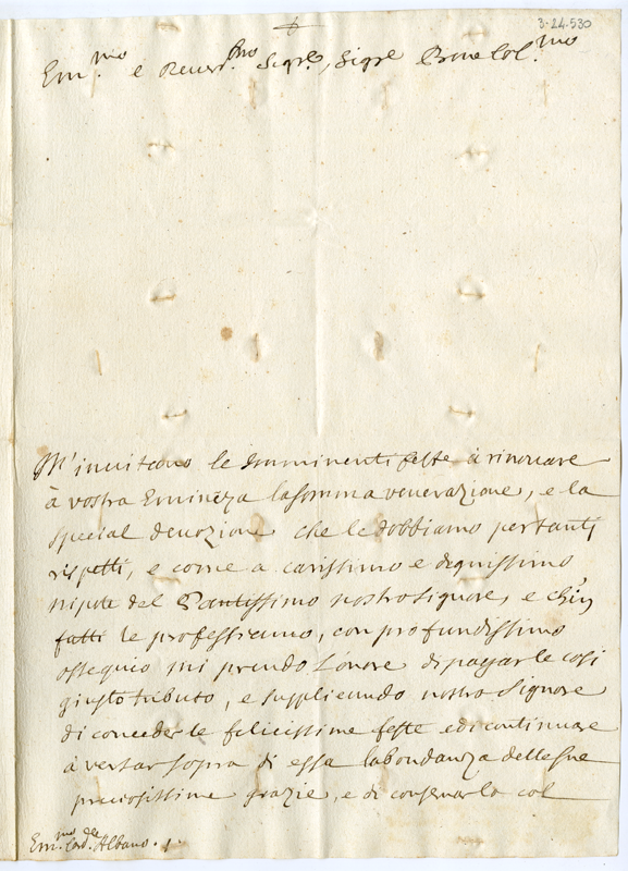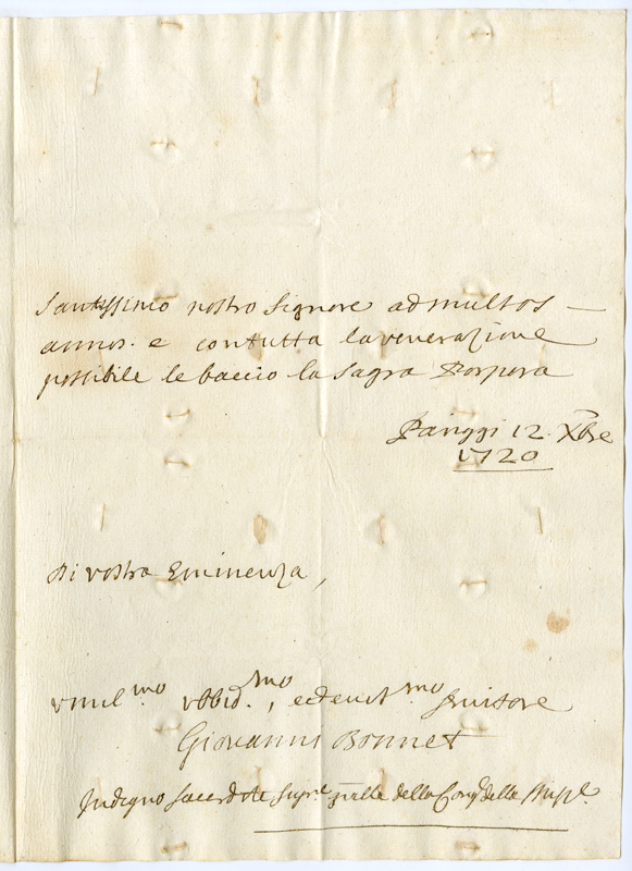 Lettera di Giovanni Bonnet al cardinale Annibale Albani (1720 dicembre 12)