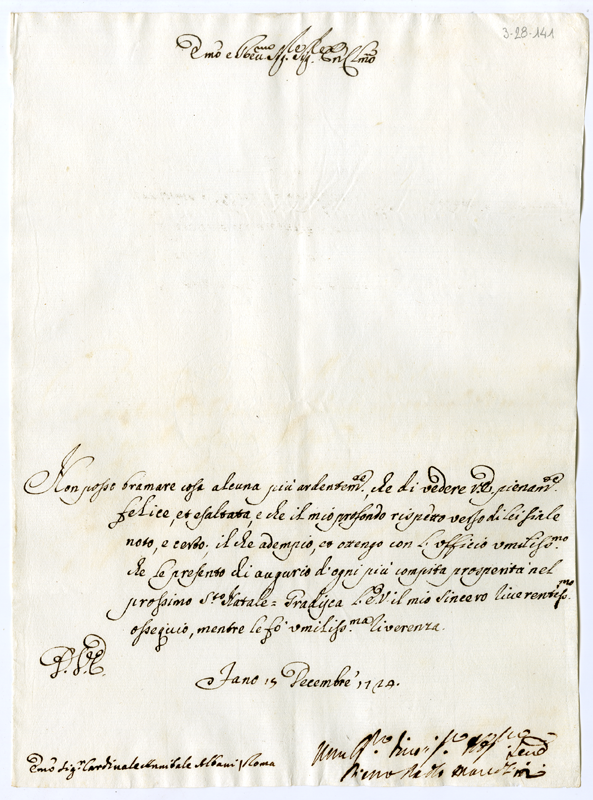 Lettera di Pietro Paolo Marcolini al cardinale Annibale Albani (1724 dicembre 15)