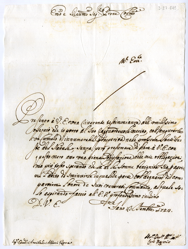 Lettera di Carlo Rezzonico al cardinale Annibale Albani (1723 dicembre 13)