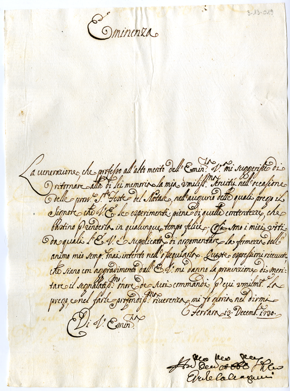 Lettera di Ercole Calcagnini al cardinale Annibale Albani (1730 dicembre 13)
