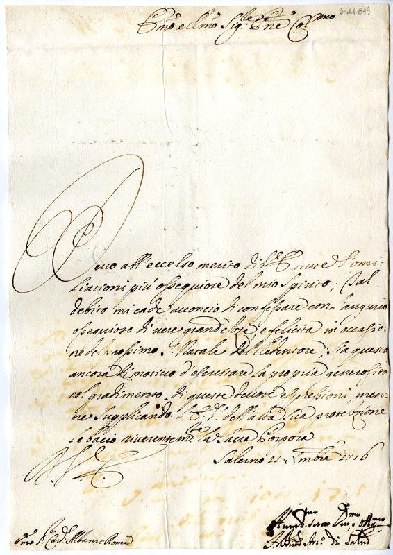 Lettera di Bonaventura arcivescovo di Salerno al cardinale Annibale Albani (1716 dicembre 21)